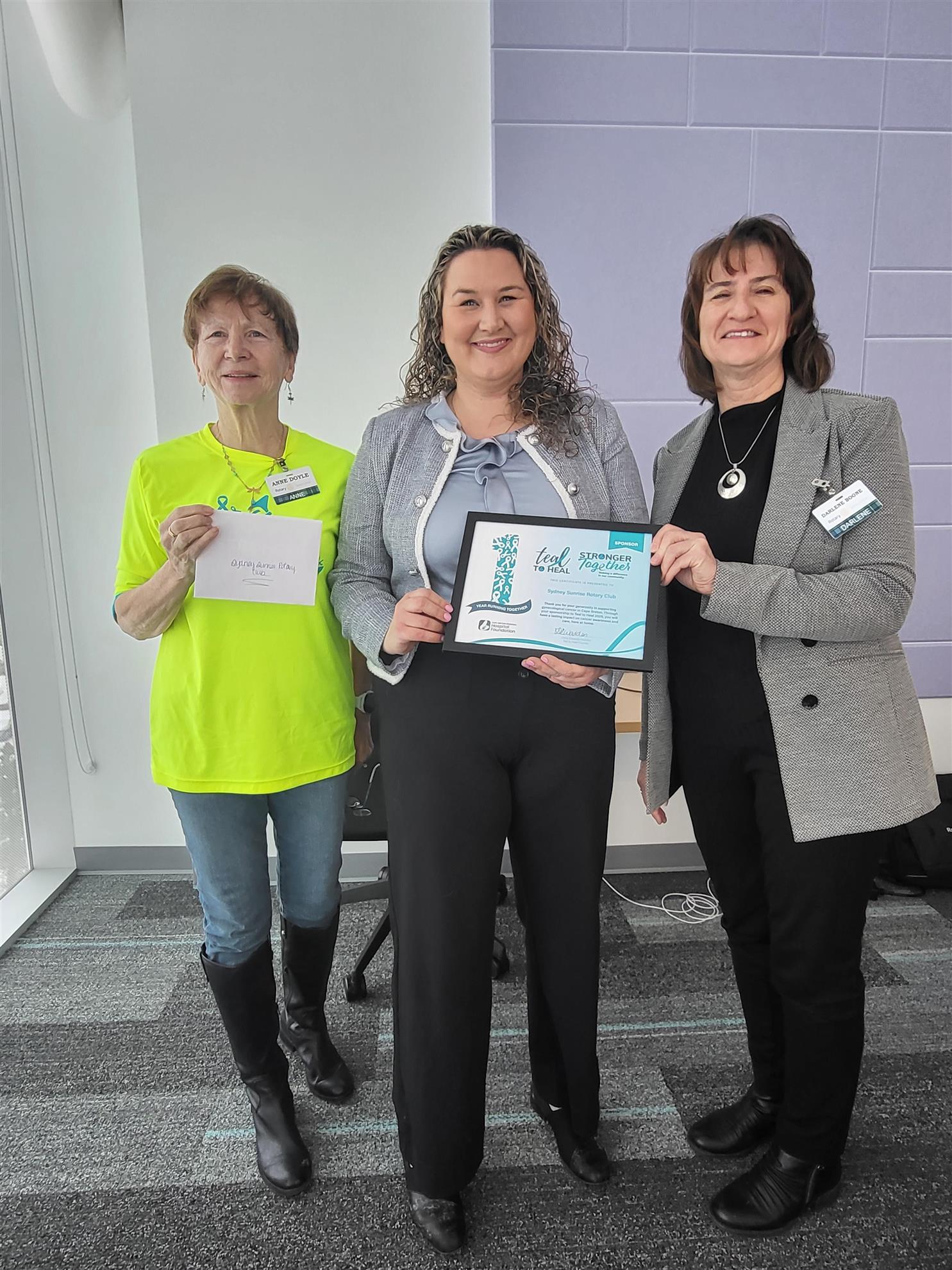 Dena Edwards of Teal to Heal stopped by to speak to the Sydney Sunrise Rotary Club on February 19th. The organization raises funds to support those battling gynecological cancers in Cape Breton. This year's event will take place on Mother's Day, May 10, 2026. Here, Dena presents a certificate of appreciation to President Darlene Boone and club member Anne Doyle for the Club's support of last year's event.. We always welcome new faces. We meet every Thursday at 7:30 a.m. At the NSCC Waterfront Campus, Building B, 5th floor Boardroom.