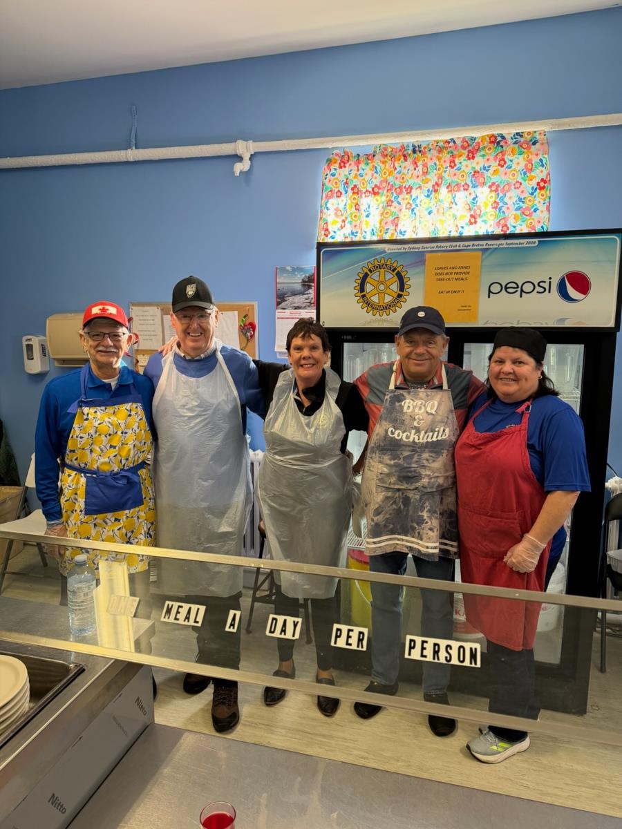 The Sydney Sunrise Rotary Club helps to fight food insecurity in our community. The Club donated $2,500 to Loaves and Fishes last year, and pays for and serves a special meal six times a year. Here Club members Linda Crockett, Ray MacNeil, Carol Miller, Michele McKinnon and Frank Ekedum serve clients on Saturday, September 20th. If you would like to join us in giving back to our community, we meet every Thursday at 7:30 a.m. At the NSCC Waterfront Campus, Building B, 5th floor boardroom .